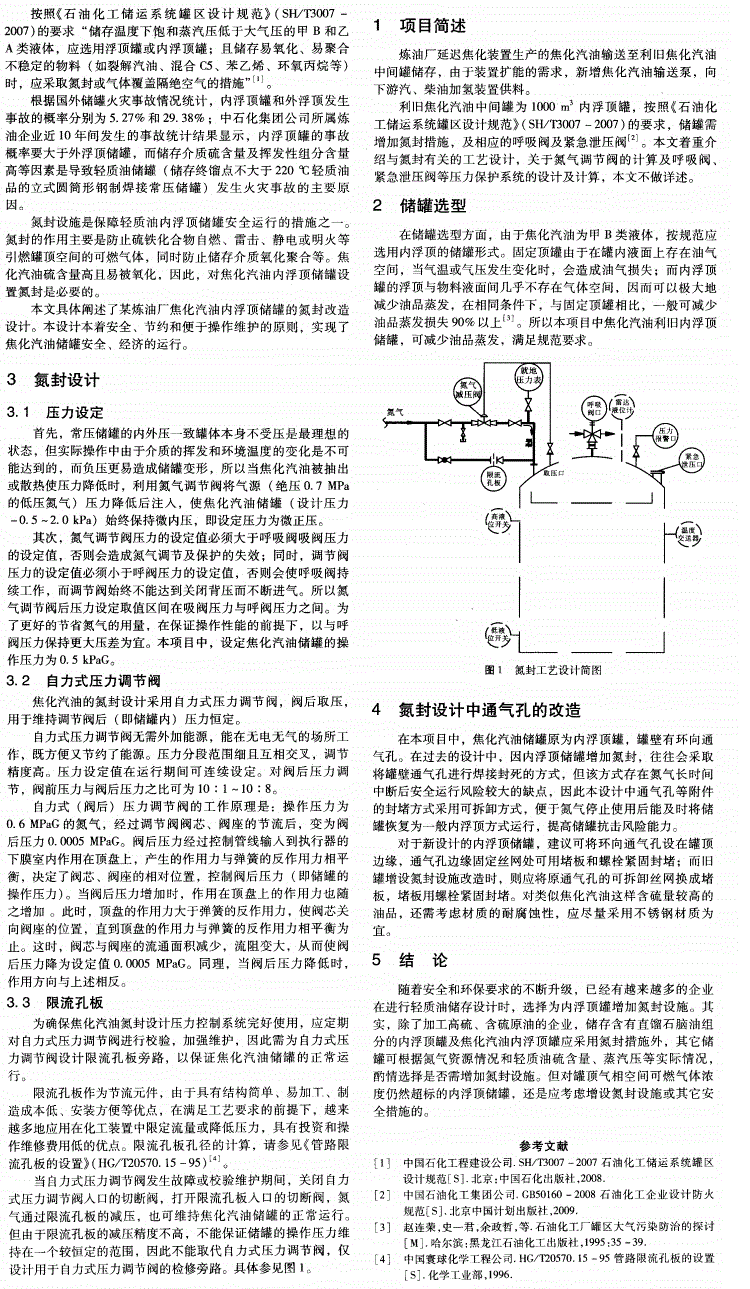 氮封設施是保障輕質油內浮頂儲罐安全運行的措施之一.氮封的作用主要是防止硫鐵化合物自燃、雷擊、靜電或明火等引燃罐頂空間的可燃氣體,同時防止儲存介質氧化聚合等.焦化汽油硫含量高且易被氧化,因此,對焦化汽油內浮頂儲罐設置氮封是必要的.氮封設計應本著安全、節約和便于操作維護的原則,實現儲罐安全、經濟的運行.